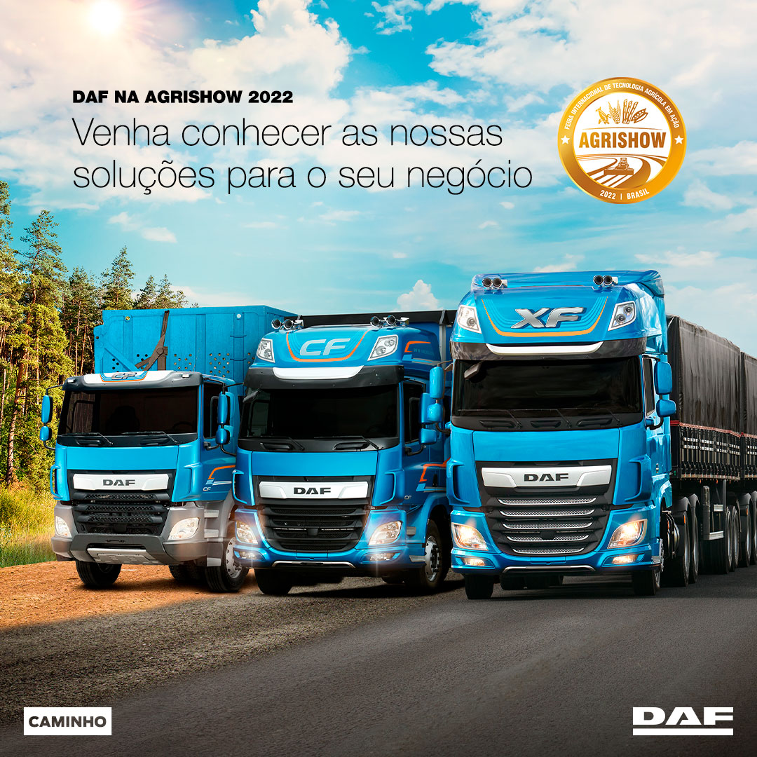 A DAF Caminhões Brasil, em parceria com a DAF Caminho, participa da 27ª edição da Agrishow 2022, que ocorre entre os dias 25 e 29 de abril. O evento traz mais de 800 marcas expositoras e deve receber perto de 150 mil visitantes, em um espaço de 520.000 m², na cidade de Ribeirão Preto (SP). No estande da marca, o público terá a oportunidade de conhecer de perto o Novo DAF XF, o caminhão mais vendido da marca, o Novo DAF CF Off-Road e o Novo DAF CF semipesado rígido com motor PACCAR GR-7.